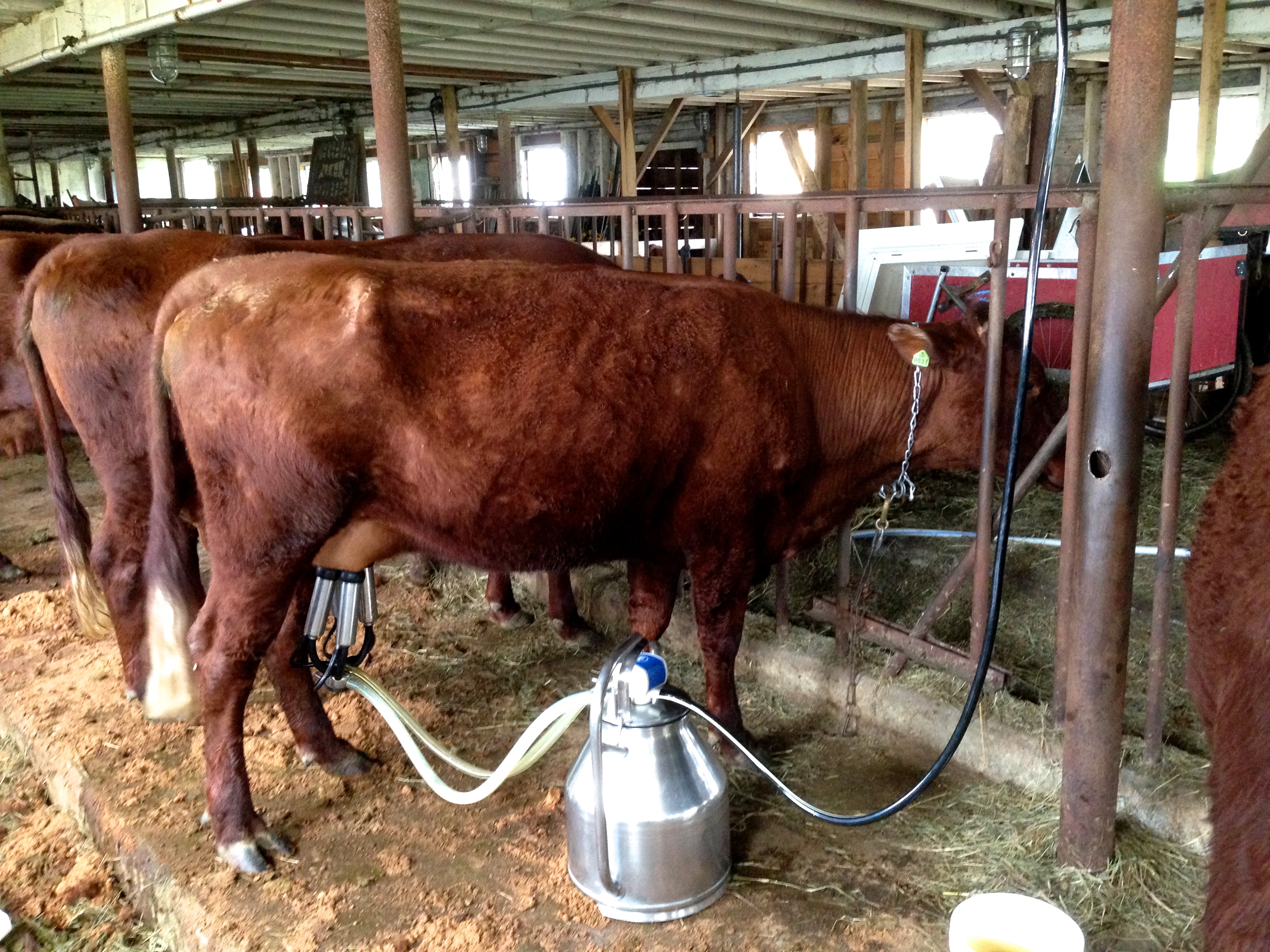 After many years of bottle-feeding calves twice a day, we’re starting to use something called the kiwi (i.e. from New Zealand) calf feeding system and it seems to be a major success. The calves get to drink more milk because we’re not limited by what we have the time to stand there and feed them through a bottle, plus they have to suck hard which produces more saliva for healthy digestion, they always nurse with their heads at the right angle so that the milk is channeled into their milk stomach instead of their grass stomach, and the feeder gets filled with water between milk meals so that they always can have access to clean fresh water and something to suck on other than each other. I have to say, I am very impressed.